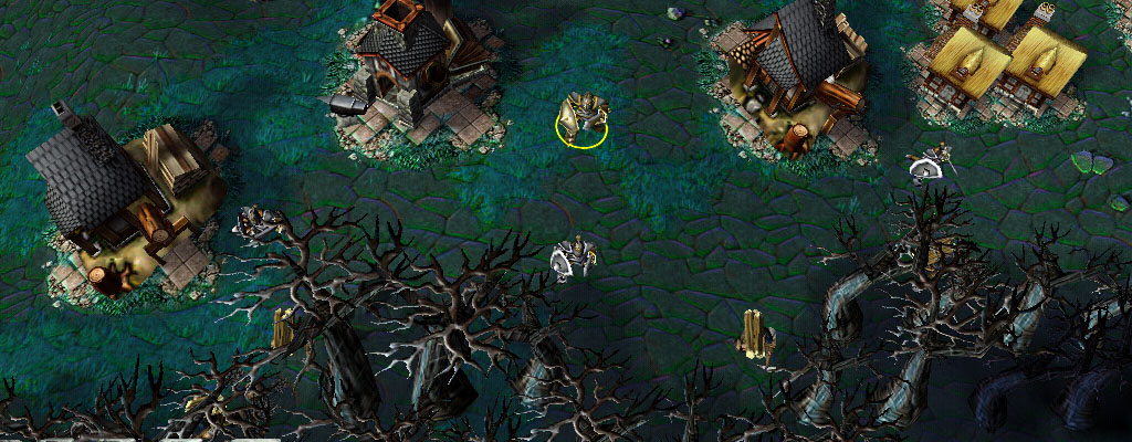 The Expeditionary Forces hacking their way through the woods in Warcraft III.