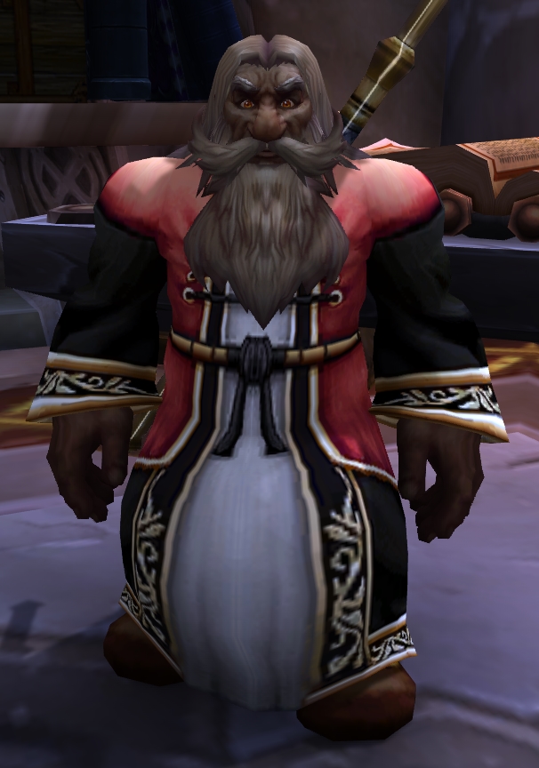 [Tablets of the Earth] to Belgrum.[2] He and Muninn Magellas tried to decipher the tablet's phrases. He was present at the ritual in Old Ironforge where he had a speech just before Magni used the tablets. He filled in as the head of Ironforge's government for a while after Magni "died".[3] Alongside High Priest Rohan, he greeted the Alliance and Horde emissaries that came in Magni's honor. He was very shocked when Moira appeared in Ironforge and was full aware that she outranks even Muradin and Brann in heritage.
