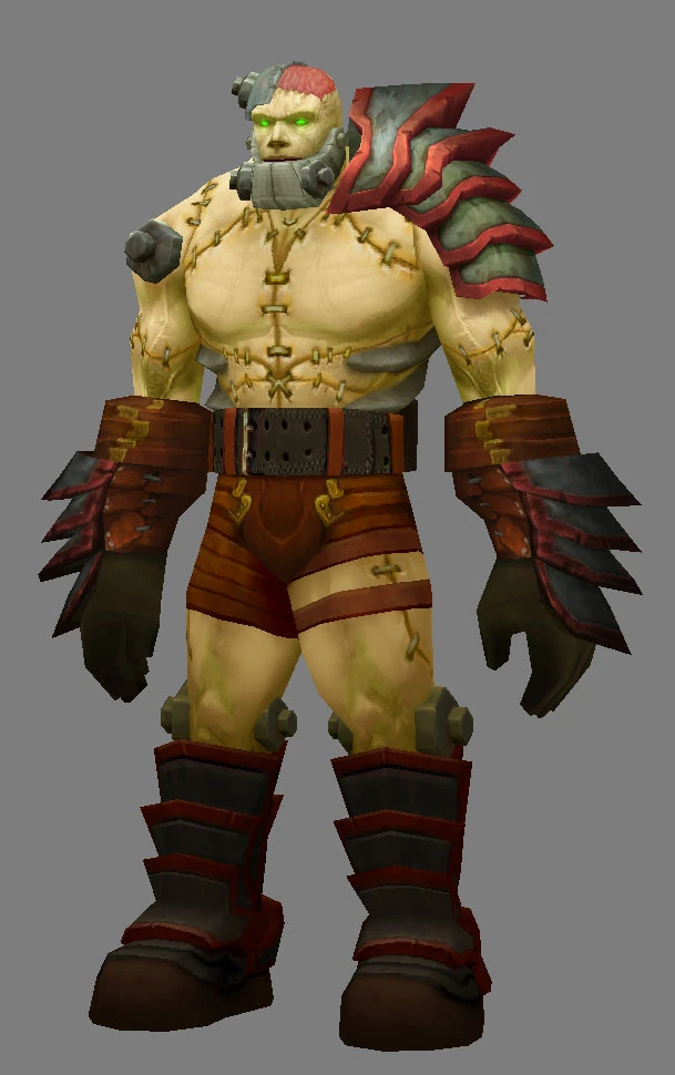 Initial concept pieces for Thaddius were very dark, focusing mostly on the blending of flesh and metal and accenting the unnatural, inhuman nature of the creature with dark brown and red color tones, dried blood, and festering stitches. The early Thaddius presented a truly chilling monster, but we felt that this version still needed some work to better fit with the general art direction of Naxxramas and the Warcraft universe. Later iterations to this effect included a few changes to the monster's color scheme, making it a little brighter, as well as some small improvements to Thaddius' armor. We also wanted his face to be easily recognizable, to set him apart from other humanoid monsters. Adding a huge metal jaw to his face achieved just that, and slowly but surely, this baddie was finally developing a really unique feel to his character.
