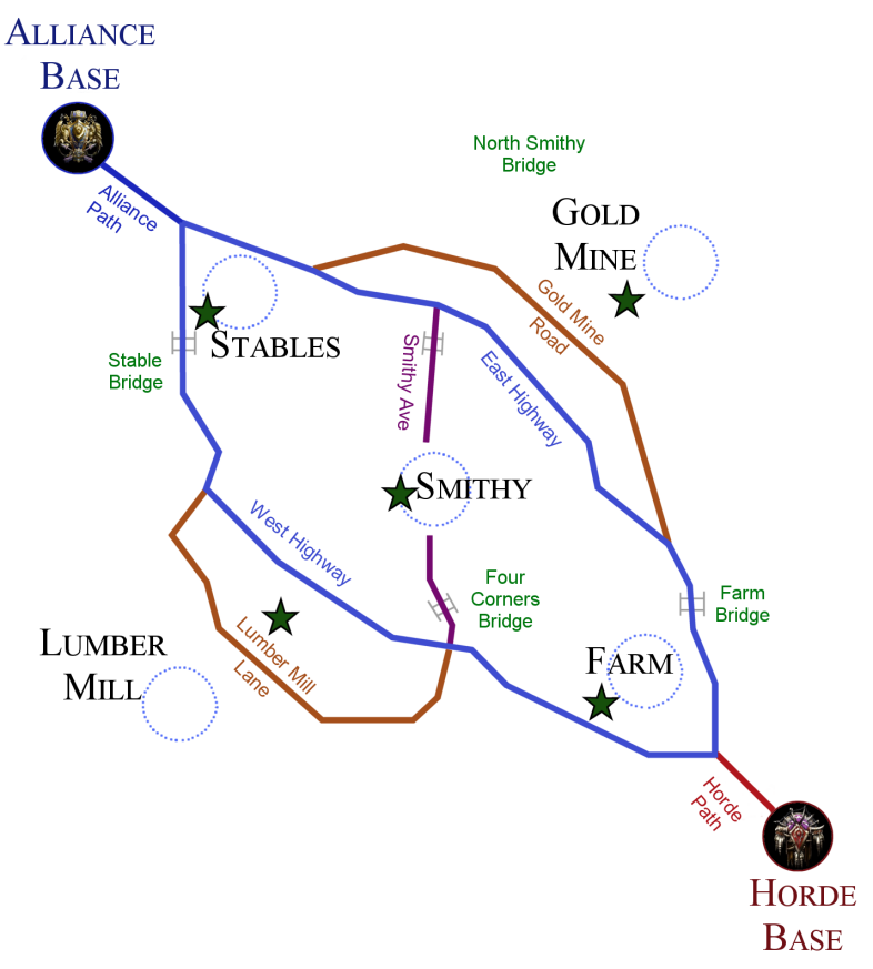A common misconception is that the "Take Three and Hold" strategy is a sure win. In fact, it is almost certainly a losing strategy. Holding three flags will not work well unless the opposing team is exceptionally uncoordinated. If your team is doing a "Five Five Five" (see above), you are susceptible to any of the other attack methods. The only three bases that lend themselves to this strategy are the farm, black smith, and lumber mill. Looking at the map will show that the road nexus between these three points make it very easy to move troops between them. This makes it very important for the alliance side to keep the horde from getting the blacksmith and makes it equally important for the horde side to get the farm and black smith as quickly as possible.
