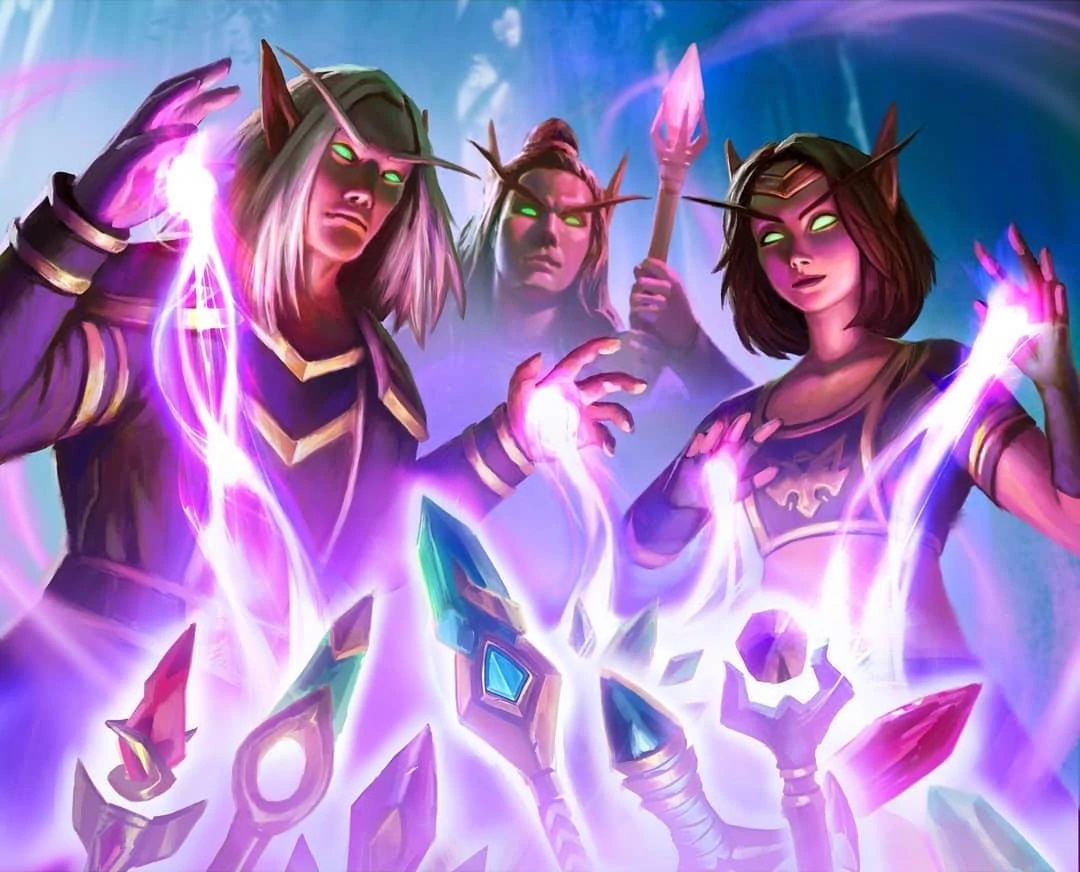 As the last ruler of the Kaldorei Empire, Queen Azshara's mastery of the arcane far surpassing and predating even the greatest of the human magi.[95][96] In "a frightening display of arcane power", she notably shatter the Tidestone of Golganneth, a Pillar of Creation able to hold Neptulon at bay,[97] and trapped the Court of Farondis in an eternal ghostly state in Azsuna, unable to pass on from the world of the living even after ten millennia spent trying to break her spell.[98] The Highborne of Shandaral accidentally caused an enormous explosion which forever transformed part of their continent Northrend into Crystalsong Forest. The high elves of Quel'Thalas bathed their land, including Eversong Woods, in eternal springtime after creating the Sunwell, while their Runestone and mooncrystal-empowered barrier Ban'dinoriel not only masked their magical activities from others, it made their realm nearly impenetrable for millennia. Empowered by the Nightwell, Grand Magistrix Elisande was able to place an entire invasion force comprised of three elven armies in a long-term temporal stasis or "time lock",[99] and could scry countless possible futures to predict likely outcomes; in combat, she was able to stop the flow of time for all but herself and send her enemies back in time, repeatedly saving herself from being killed, although this required a considerable amount of even her energy.[100] Illidan Stormrage nearly destroyed the Frozen Throne and its Lich King by tapping into the nexus of potent ley lines near Dalaran, and unleashing a massive "tempest of arcane energy" towards Northrend, causing fissures to erupt around the world.[101]