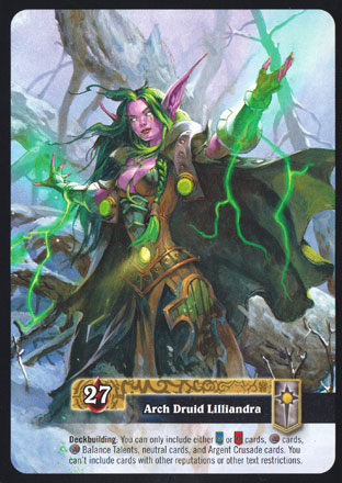 Argent Crusade Reputation Flip Lilliandra, remove a Druid in your graveyard from the game → When Lilliandra is dealt combat damage this turn, she deals 1 nature damage to the source of that damage. Deckbuilding: You can only include either Alliance or Horde cards, Druid cards, Druid Balance talents, neutral cards, and Argent Crusade cards. You can't include cards with other reputations or other text restrictions. |