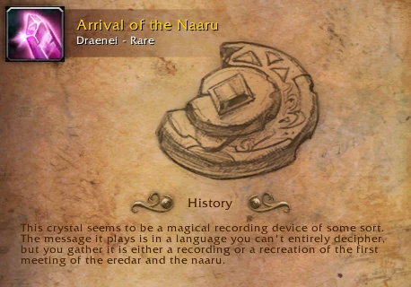 This crystal seems to be a magical recording device of some sort. The message it plays is in a language you can't entirely decipher, but you gather it is either a recording or a recreation of the first meeting of the eredar and the naaru.