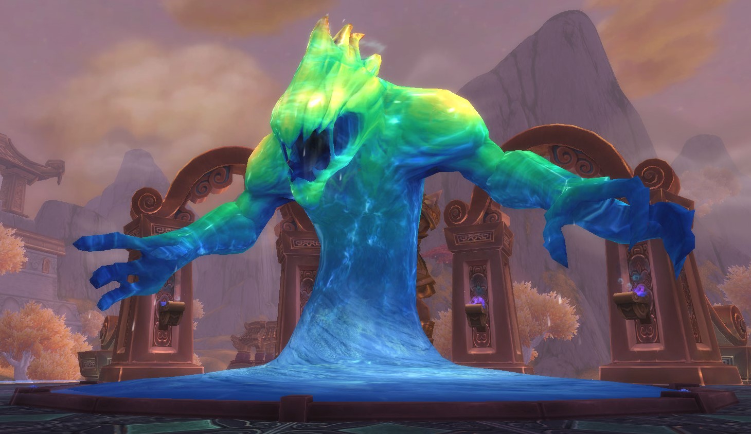 Aspersius is a water elemental located at the Terrace of Endless Spring, it was corrupted by the Burning Legion when they invaded the area. The corrupted water elemental is fought by a party consisting of the Grand Master, Taran Zhu, Taoshi, Hawkmaster Nurong and Fei Li, who vanquish the hostile elemental and claim