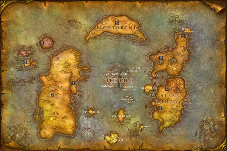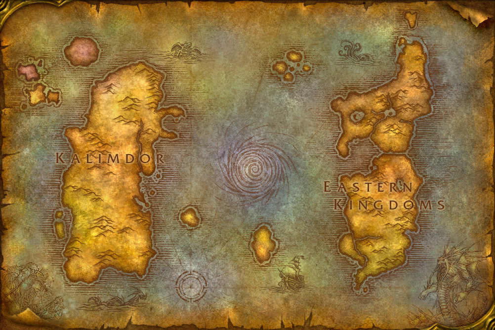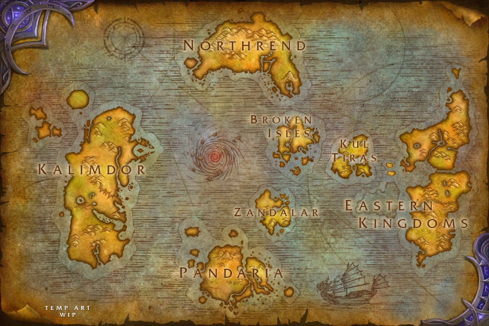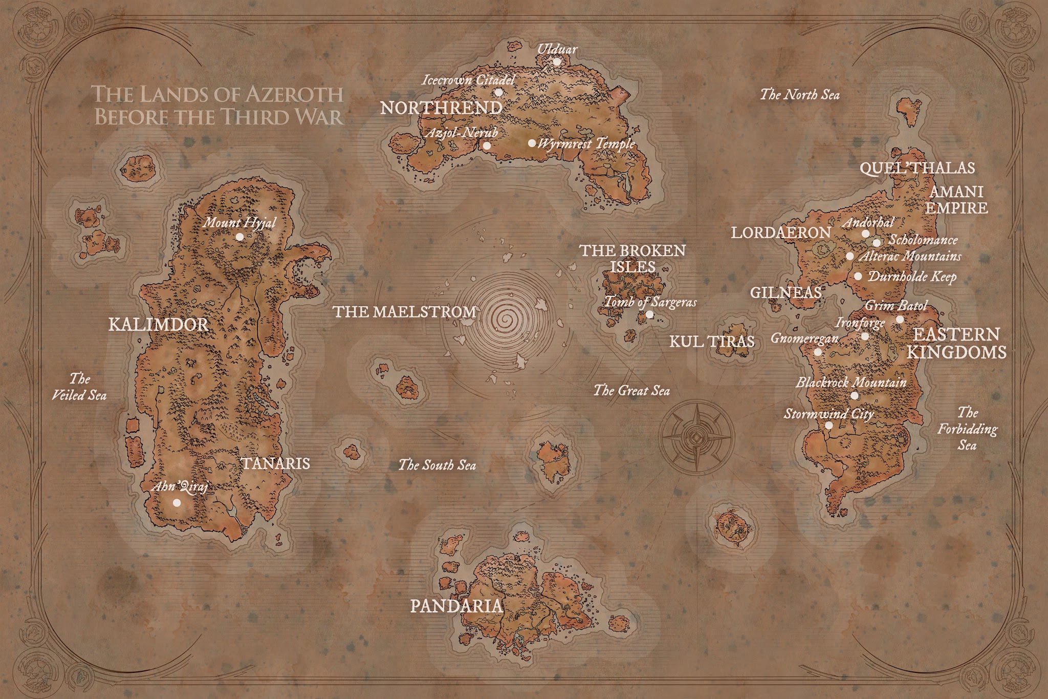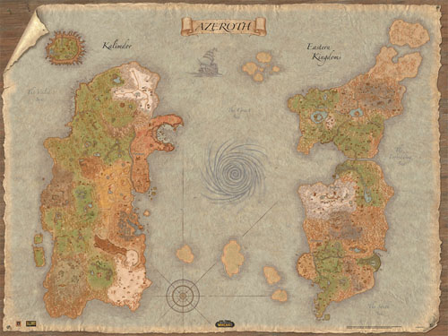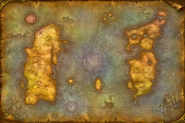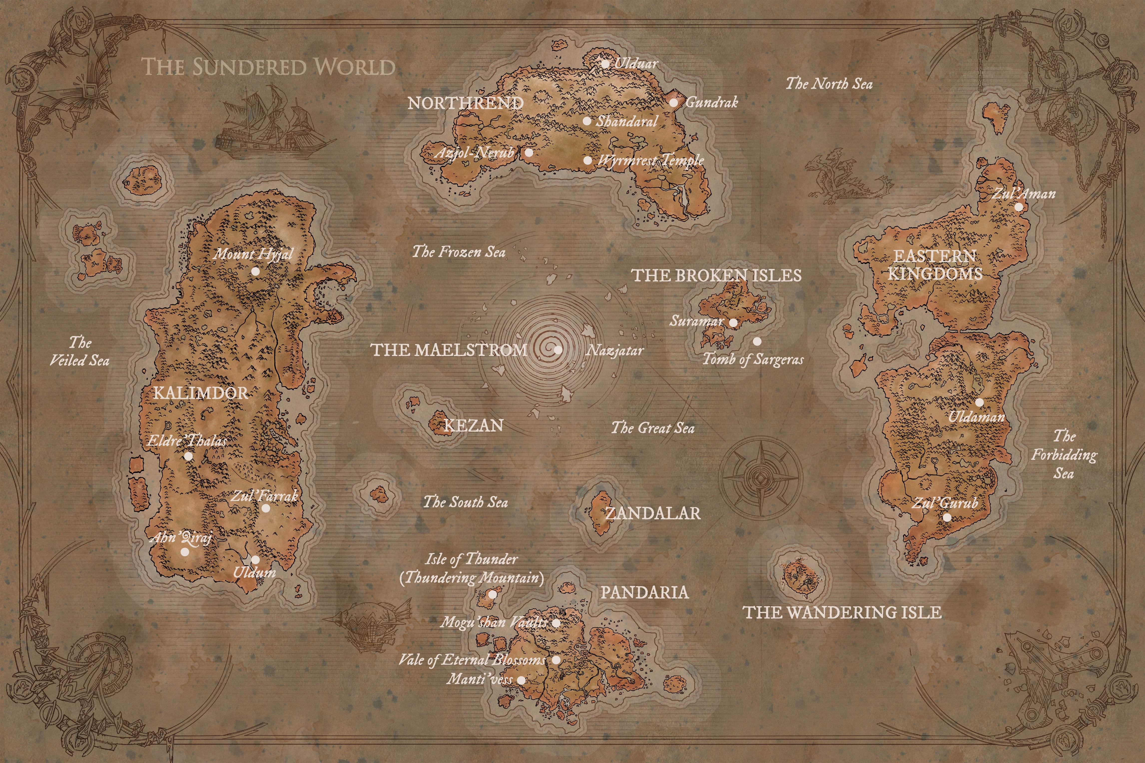 The world of Azeroth is comprised of four major continents, with a number of islands scattered about them. The Great Sea is located in between the four landmasses, and at the center of it is the Maelstrom — a massive chaotic whirlpool and all that remains of the ancient Well of Eternity. To the east lies the Eastern Kingdoms, which is made up of three major regions. Azeroth to the south, Khaz Modan in the middle, and Lordaeron to the north, these last two separated by a channel and connected by the dwarven bridge of Thandol Span. To the west, across the ocean, is Kalimdor, which is also divided into three regions. North of the sea lies the frozen continent of Northrend, and to the south the newly discovered landmass of Pandaria, which had been isolated and shrouded by dense mists during the last 10,000 years. The islands of Zandalar, Kul Tiras, and the Broken Isles have been of major importance in recent events.