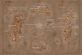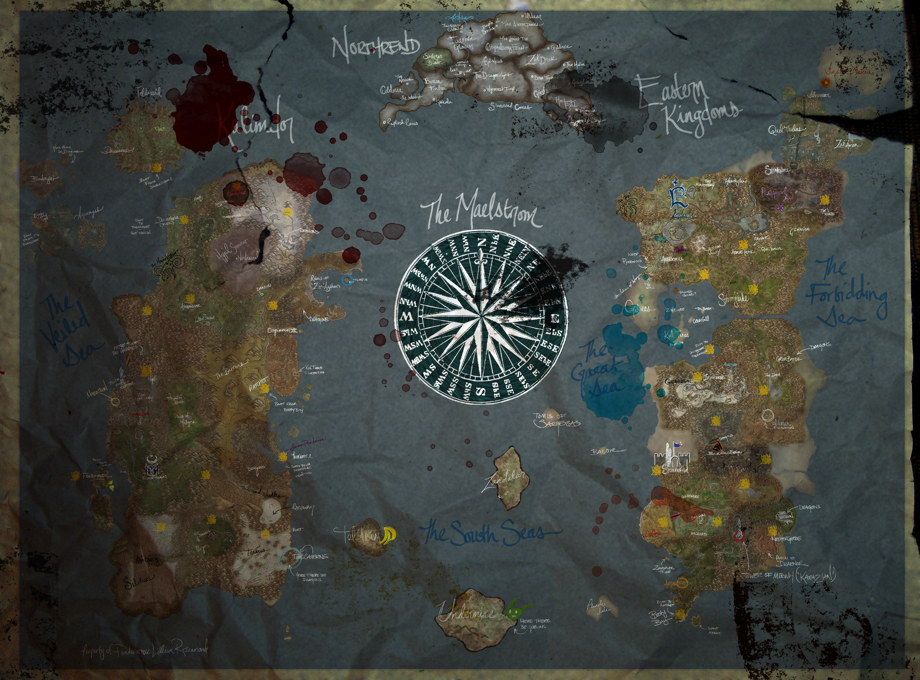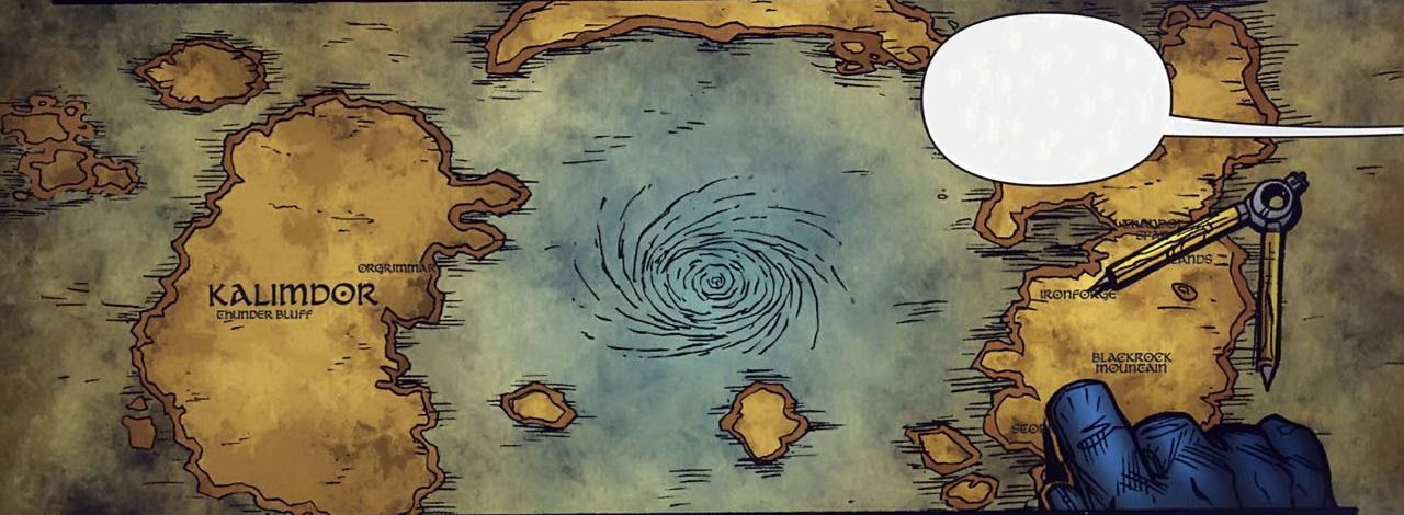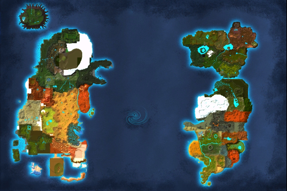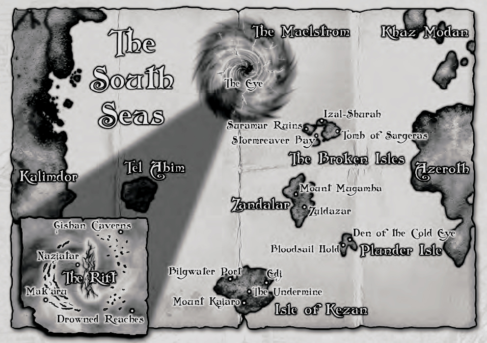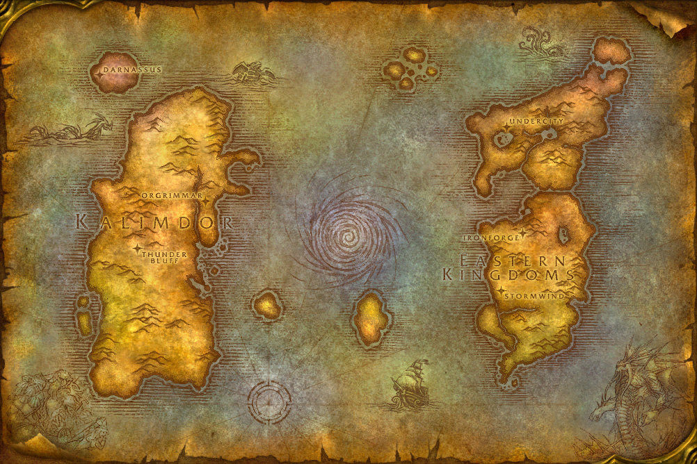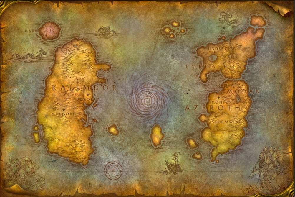 The world of Azeroth is comprised of four major continents, with a number of islands scattered about them. The Great Sea is located in between the four landmasses, and at the center of it is the Maelstrom — a massive chaotic whirlpool and all that remains of the ancient Well of Eternity. To the east lies the Eastern Kingdoms, which is made up of three major regions. Azeroth to the south, Khaz Modan in the middle, and Lordaeron to the north, these last two separated by a channel and connected by the dwarven bridge of Thandol Span. To the west, across the ocean, is Kalimdor, which is also divided into three regions. North of the sea lies the frozen continent of Northrend, and to the south the newly discovered landmass of Pandaria, which had been isolated and shrouded by dense mists during the last 10,000 years. The islands of Zandalar, Kul Tiras, and the Broken Isles have been of major importance in recent events.