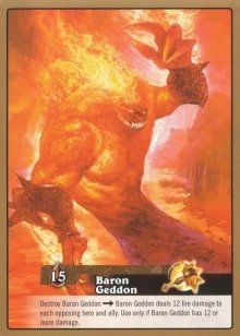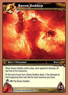 FRONT: When Baron Geddon enters play, each opponent destroys all but five of his resources. At the end of your turn, Baron Geddon deals 1 fire damage to each opposing hero and ally for each resource you have. ↓ → Flip Baron Geddon.