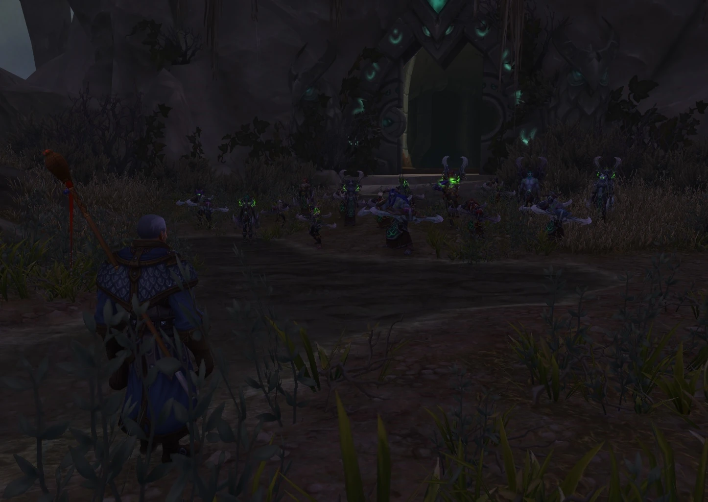 Upon Bastillax's death, the demon hunters all run east out of the chamber to gather outside the Vault's entrance. Assembled outside the dungeon are Kayn/Altruis, Allari the Souleater, Asha Ravensong, Cassiel Nightthorn, Cyana Nightglaive, Falara Nightsong, Jace Darkweaver, Kor'vas Bloodthorn, Lyana Darksorrow, Marius Felbane, Sevis Brightflame, Baric Stormrunner, Belath Dawnblade, Cailyn Paledoom, Izal Whitemoon, Sirius Ebonwing, Tirathon Saltheril, and Zaria Shadowheart. As soon as the player joins them, a raven lands a short distance away and transforms into Archmage Khadgar.