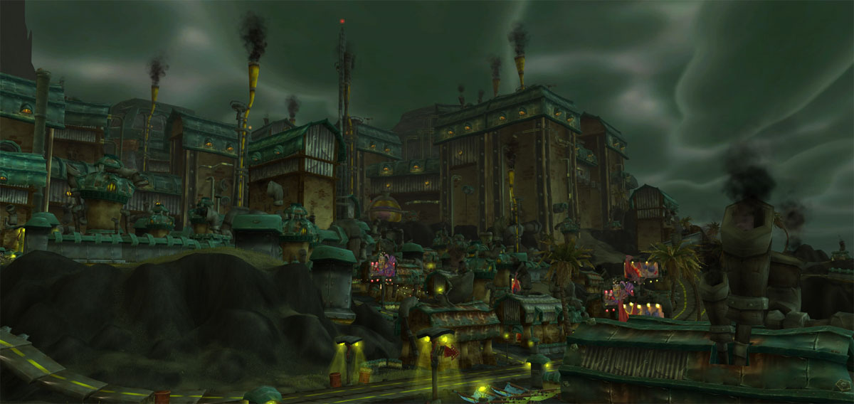 The city is divided by walls into four 'districts' surrounding a massive inaccessible factory. The districts are: Swindle Street to the north, an unnamed district to the east that contains Kajaro Field, Drudgetown to the south, and another unnamed district to the west that contains the First Bank of Kezan, a food court, and some housing. There is also a gas station in the northern part of it, across a large road. The port is flanked by Gallywix's Villa to the west, and KTC Headquarters and Kaja'mine to the east. The shore of the port is known as the Slick.