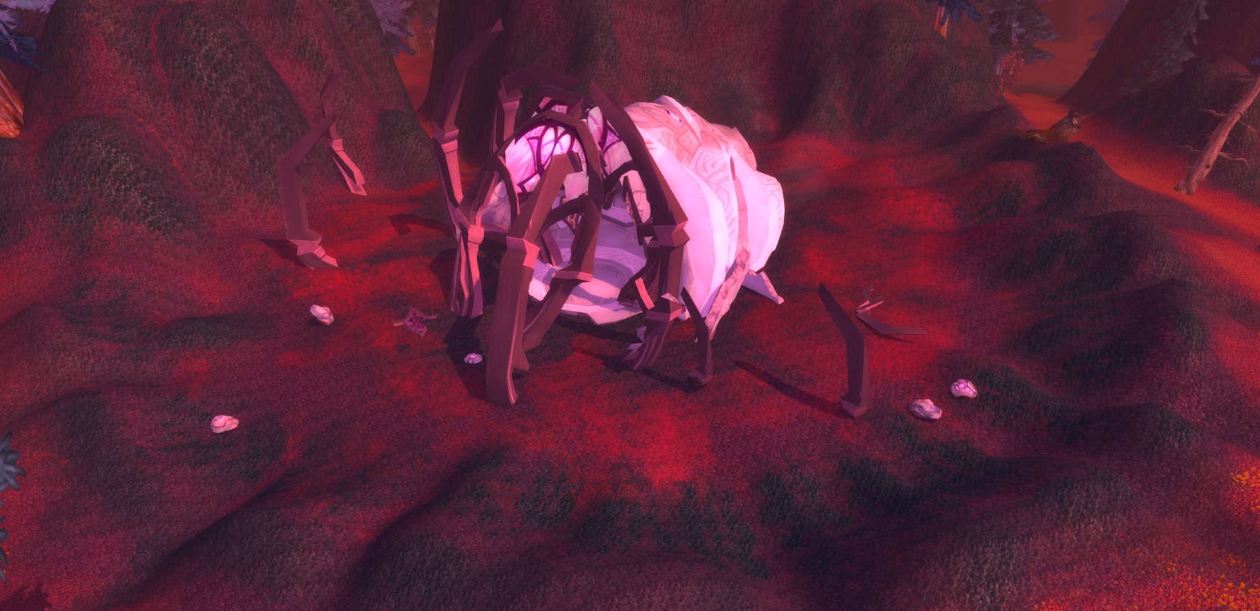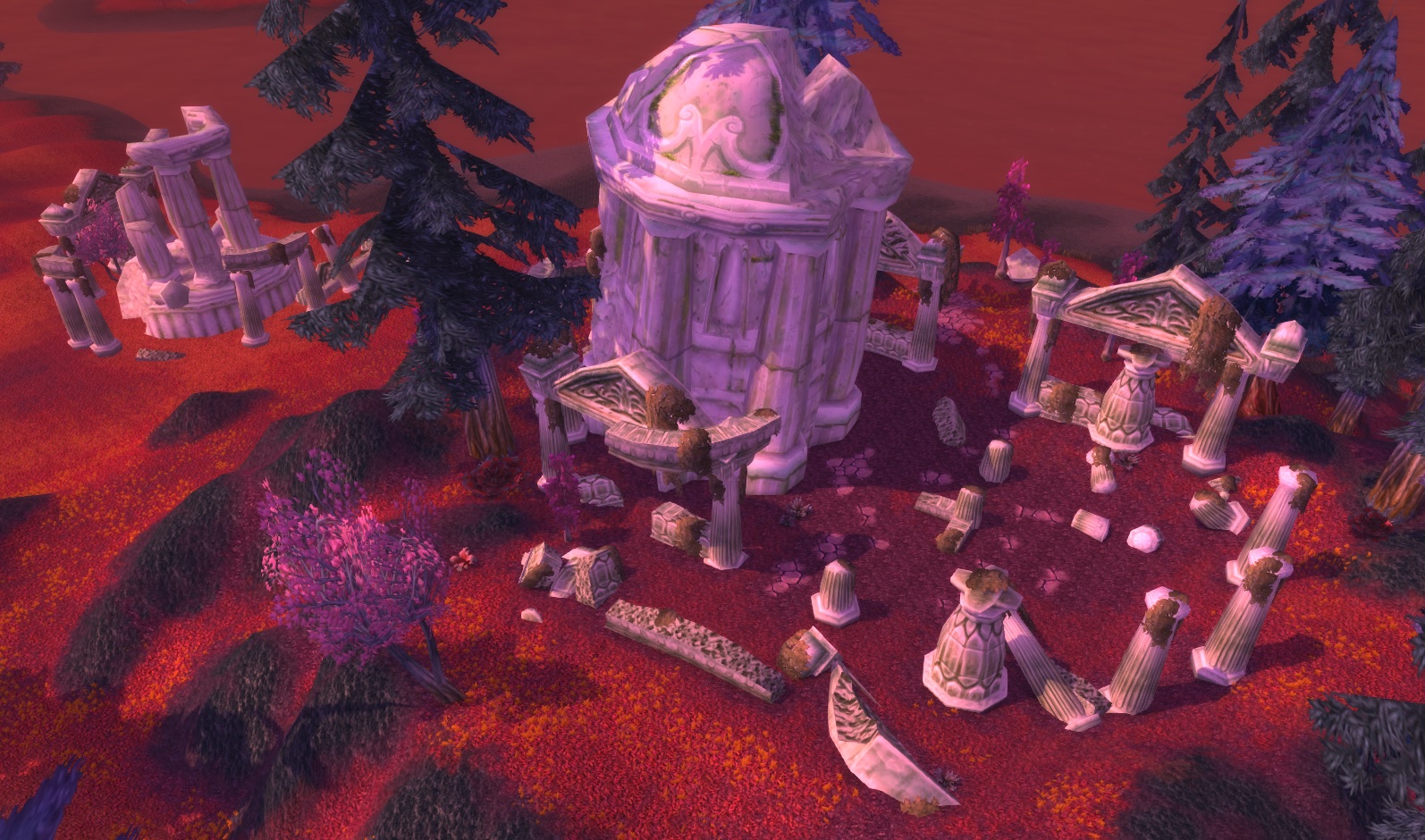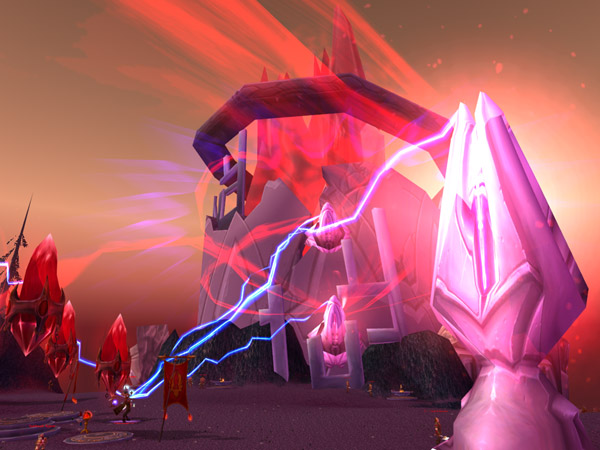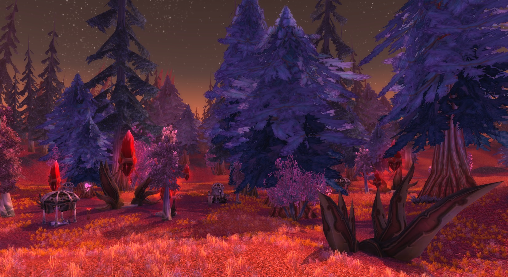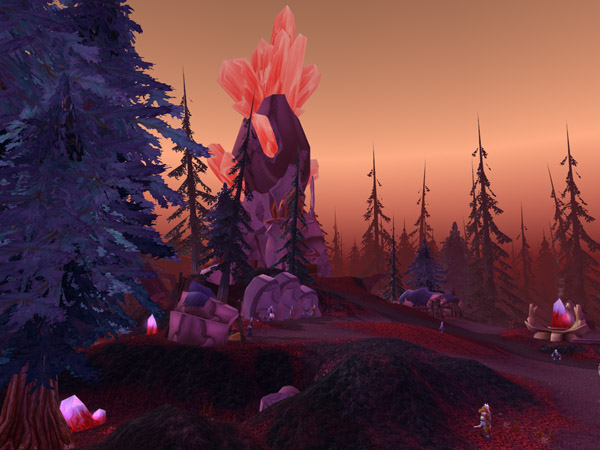 Bloodmyst Isle has been ravaged by radiation from the crashed draenei ship, the Exodar. Red crystals dot the land, and the eerie red mist for which the isle was renamed covers everything. Even the great pine trees which cover the island have taken on a crimson tinge. The creatures of the isle have mutated, in some cases becoming hostile. The draenei, hoping to find a way to restore the island, have set up an outpost known as Blood Watch near the center of the island.