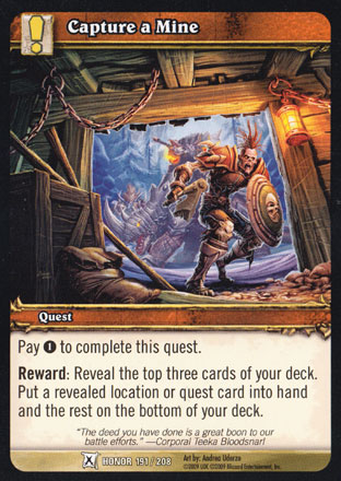 Pay (1) to complete this quest. Reward: Reveal the top three cards of your deck. Put a revealed location or quest card into hand and the rest on the bottom of your deck. |