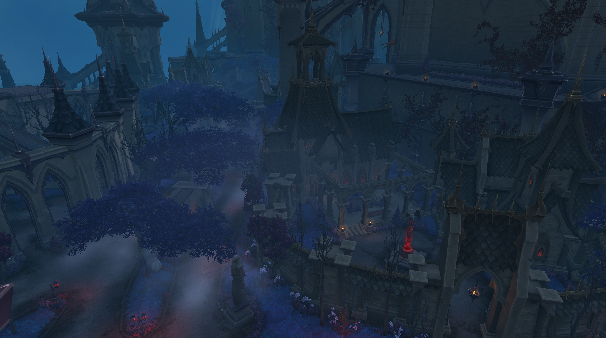 The Chalice District contains venthyr nobility that do not belong to one of the estates of the Redelav District. The area is bordered by the Redelav District to the north, the Grand Palisade to the east and south, the Charred Ramparts to the southwest, the Court of the Harvesters to the northwest, and communicates with Darkwall Tower through an elevator in the southwest.
