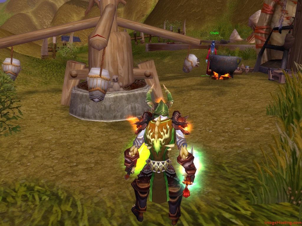 Challe herself (a troll female) stands next to the hut, watching over the babies inside. Two tykes, Sa'rah (a blood elf girl) and Chaddo (a human boy) run around the place, while a third named Jara (an orc boy) hides in a corner of the sandbox.