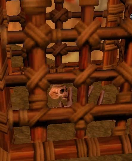 Behind the hut are three cages of varying sizes and types. In one is the remains of a small humanoid.