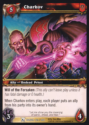 Will of the Forsaken When Charkov enters play, each player puts an ally from his party into its owner's hand. |
