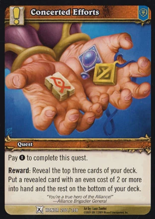 Pay (1) to complete this quest. Reward: Reveal the top three cards of your deck. Put a revealed card with an even cost of 2 or more into hand and the rest on the bottom of your deck. |
