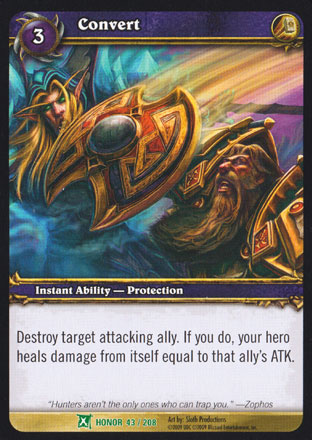 | Rules | Destroy target attacking ally. If you do, your hero heals damage from itself equal to that ally's ATK. |