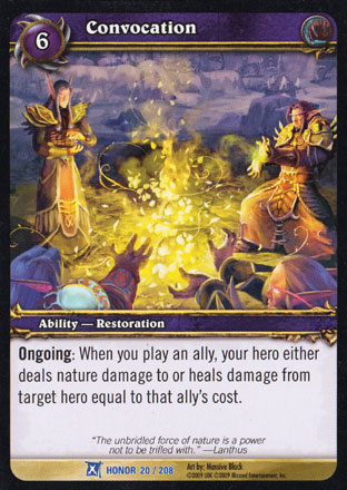 | Rules | Ongoing: When you play an ally, your hero either deals nature damage to or heals damage from target hero equal to that ally's cost. |