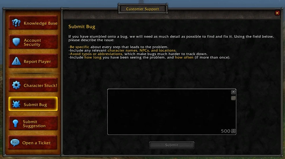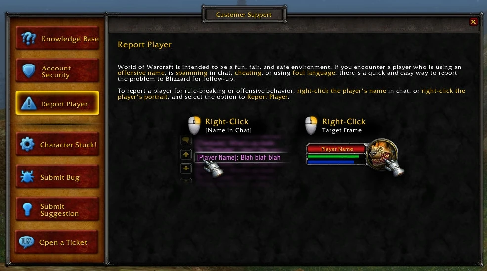 Customer Support is a window dedicated to helping World of Warcraft players with any issues they may be having within the game, from harassment to getting stuck, and even offering a way to make suggestions for the game.