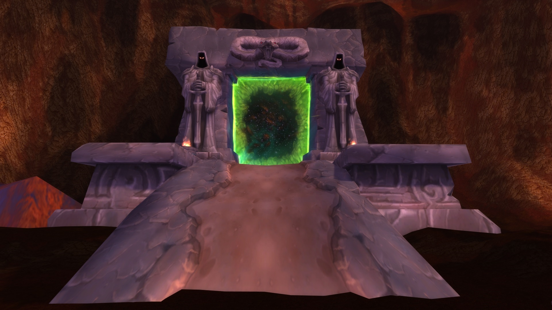 When World of Warcraft launched, the Dark Portal was a noticeable (but unusable) feature in the Blasted Lands, located southeast of Stormwind in the Eastern Kingdoms. The Portal is located in the southeastern corner of the Blasted Lands and (until patch 2.0.1) was surrounded by elite demons and servants of the named demons, and the glow around the Portal's gateway was blue, indicating its inactivity. When a player walked through the gate they merely passed through to the back of the gate as if nothing was there - the portal was merely for show in game. At the time, the portal was considered to be decorative only, a piece of Warcraft lore to look at. The Portal on the Azeroth side appears to be rather simple - the only decoration on it being the two "guardians" on either side of the gateway and the coiled snake-head above it.