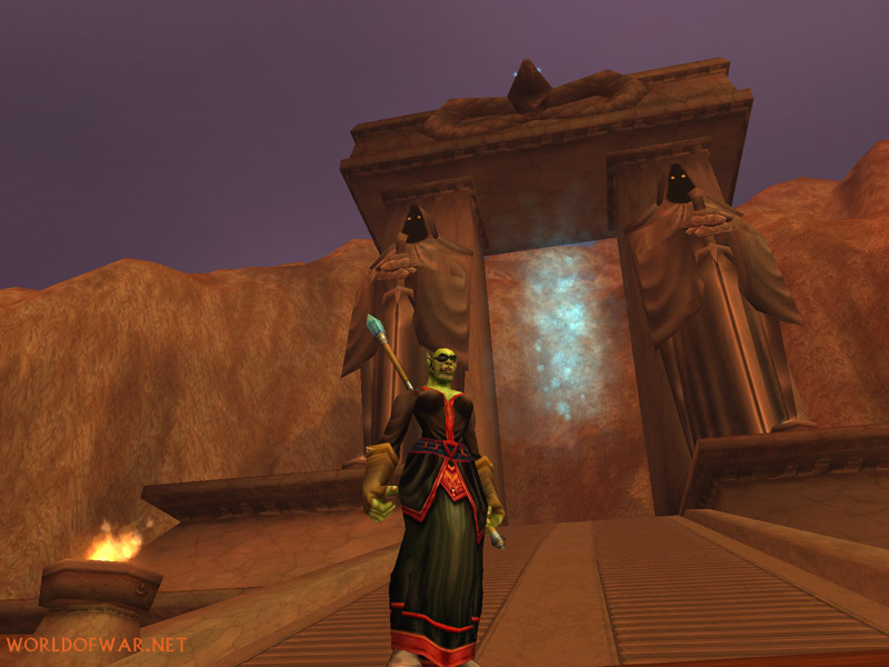 The Portal was later reconstructed when the orc chieftain Ner'zhul, in search of powerful enchanted artifacts with which to open yet more portals, reopened the rift from Draenor and sent his forces back to Azeroth. As had been done with the first portal, the Horde built a physical frame around the rift, creating a new Dark Portal that could remain open permanently without needing a constant influx of power.[22] This second version, flanked by carvings of large, hooded figures wielding swords and crowned with a stone serpent baring its fangs as if petrified mid-strike, is the one known to most modern adventurers; it stands to this day within the Blasted Lands of the Eastern Kingdoms.