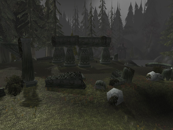 Darkshore covers northwestern Kalimdor, and the tainted land of Felwood rises to Hyjal to the southeast. The rocky cliffs, sandy soil, and ever-present sea mist ensure that little worth noting grows in Darkshore. Kelp, seaweed, and rocks litter the beaches, and a few sparse trees dot the landscape away from the beach. Once a thriving night elf settlement, it is little more than a desolate beach dotted with ruined buildings. The weather is cold and stormy much of the time, with a wicked wind stirring up the waves. Rain and fog are prevalent for a good part of the year, allowing only the most talented sailors to navigate the dangerous waters. Shipwrecks of the less talented litter the shallower waters and beach. The night elves currently living in Darkshore have focused their attention on rebuilding Auberdine. Most of the town is made up of new buildings, as the night elves cleared away the ruins they could not restore. Many ruins remain outside Auberdine, and harsh winds and salt water continue to corrode the once sturdy buildings. These worn pillars and crumbling structures are not totally abandoned - stories abound that murlocs and naga are slowly taking the ruins for their own.