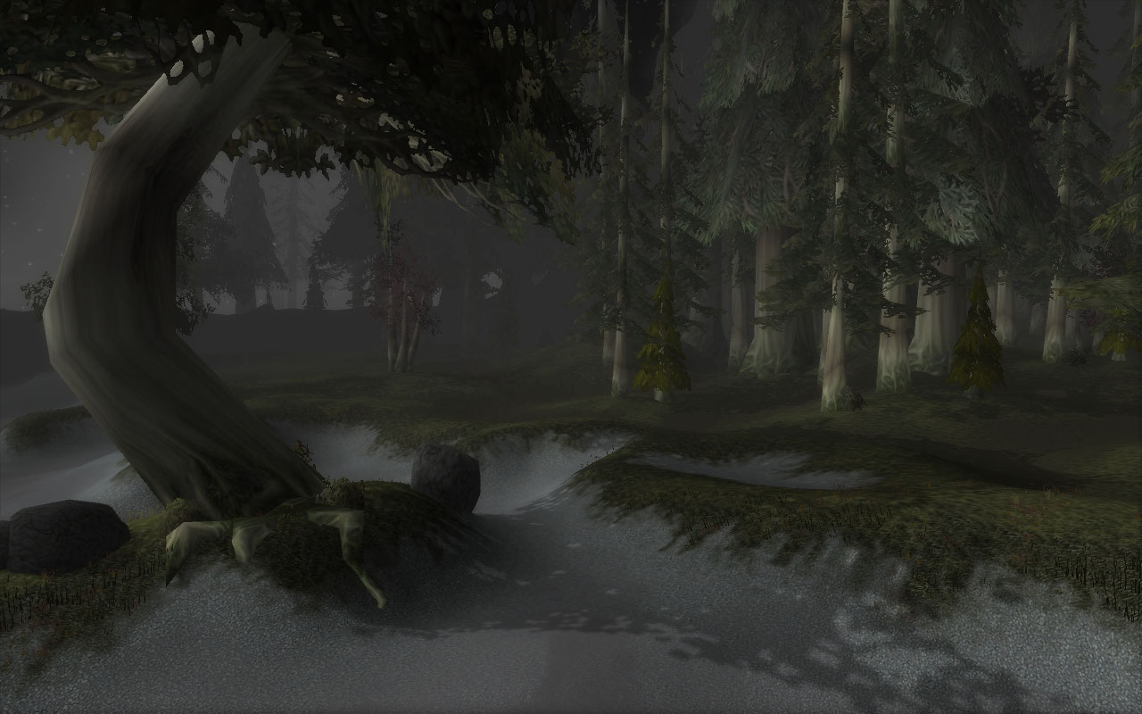 Darkshore consists of a long strip of coastline in northwestern Kalimdor. It is sheltered to the east by mountains, which protect the wildlife in Darkshore from most the taint of the Felwood. Unfortunately the taint has spread into Darkshore via the various rivers flowing through the zone from their sources in Felwood; bringing the taint with them which is turning the land grey and dead, and poisoning the wildlife and furbolgs with an insatiable rage. Between the mountains and the beach lies a forest consisting mainly of evergreens. To the south, the forest thickens and the mountains recede, leading into the deep wilderness of Ashenvale.
