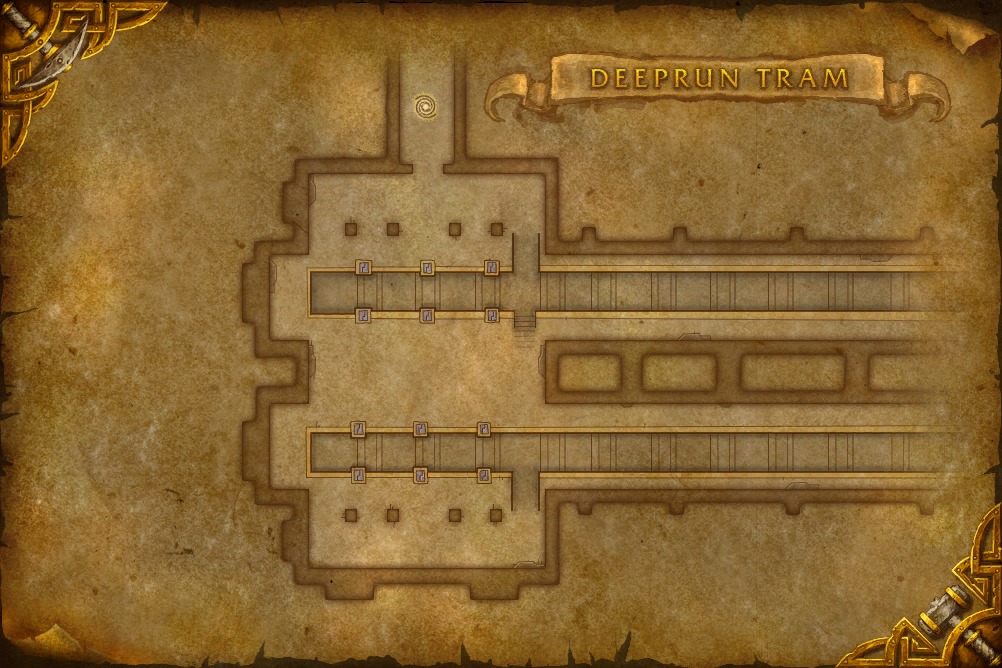 The Deeprun Tram (or simply the Tram)[1] is a long, fully enclosed, underground (and partially underwater) set of double tracks upon which rolls two sets of three wagons, all credited to the gnomes' technical engineering. The service is fast and smooth, and is provided free of charge to travelers between the Alliance-aligned cities of Ironforge and Stormwind City. There is also a quest here that starts on the Ironforge side and ends on the Stormwind side that involves catching rats.