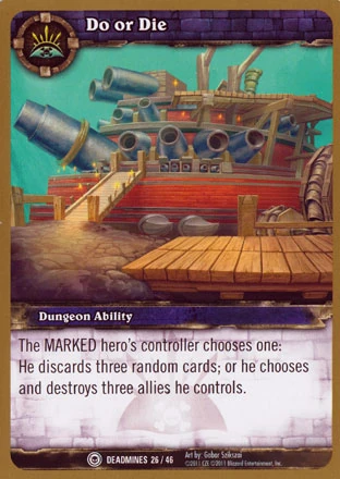 | Rules | The MARKED hero's controller chooses one: He discards three random cards; or he chooses and destroys three allies he controls. |