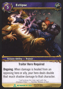 Traitor Hero Required Ongoing: When damage is healed from an opposing hero or ally, your hero deals double that much shadow damage to that character. |