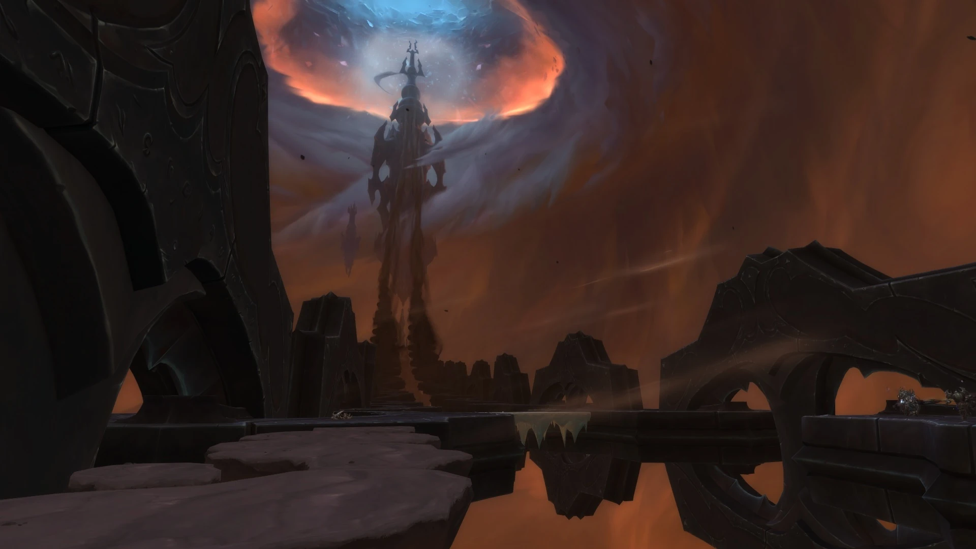 The Edge of the Abyss is a portion of "the vastness between the Maw and the Eternal City"[1] traversed during the second stage of the Sylvanas Windrunner encounter in the Sanctum of Domination. At the end of the encounter's first stage, the Jailer sends out two enormous chains from the Pinnacle of Domination that latch onto Oribos and begins heading to the Crucible. Jaina creates a portal to let the party pursue him, depositing them on the Edge of the Abyss. The players and their allies travel across the abyss by using the Jailer's chains as bridges, with Jaina and Thrall creating additional pathways of ice and earth between the two, while Sylvanas and groups of Mawsworn try to waylay them. At the end of the stage, Jaina creates another portal to the Crucible for the third and final part of the encounter.