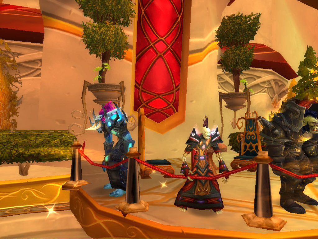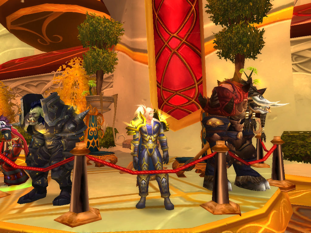 The Tauren Chieftains can otherwise be found at rest in Silvermoon City's Walk of Elders on a balcony overlooking the walk. Their stage manager and stage tech, Michael Schweitzer and Roitau respectively, both sit below the band. Their purpose in Silvermoon City was initially uncertain, but it has since been learned that the band is placed there as part of the Children's Week quest chain for Horde players, which begins in Shattrath City.[5] Performing emotes to them, such as cheer, will cause them to respond in turn. The band and their manager remain friendly to Alliance players and will still respond to emotes.