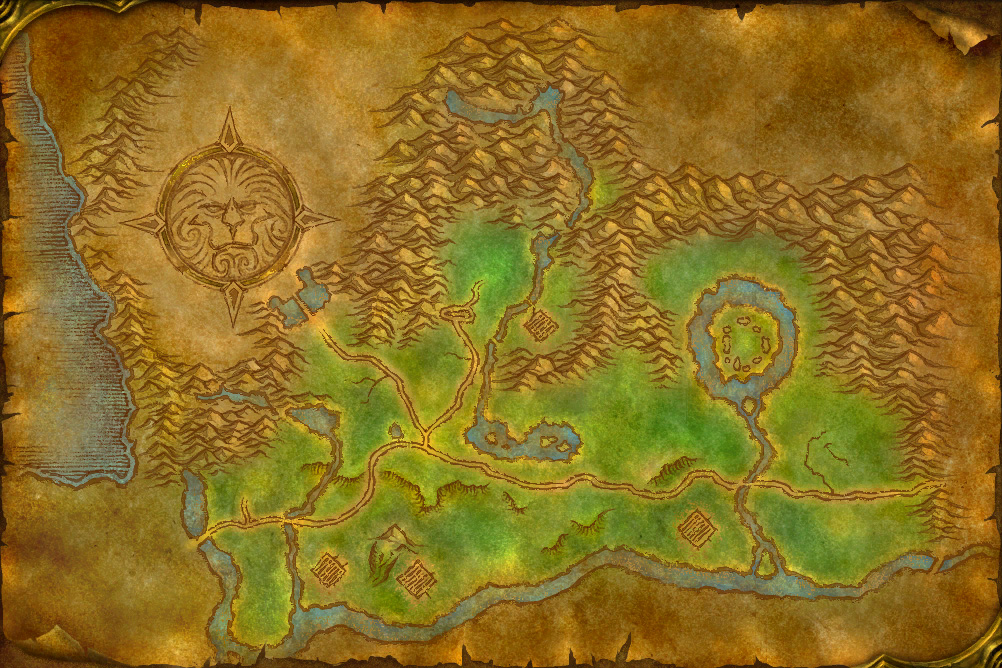 Elwynn Forest is depicted close to its World of Warcraft incarnation. It contains the communities of Goldshire and Northshire Abbey.