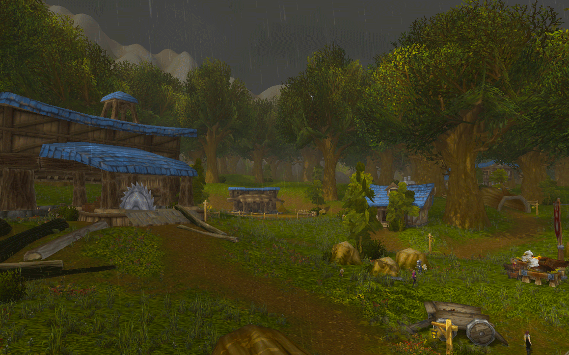 Elwynn is a gorgeous span of fertile land and thick forests. The weather is brightly sunny and cheerful during the day and silent and peaceful at night. Unlike Duskwood, it is close enough to Stormwind to enjoy considerable Alliance guardianship. Home to many farmers, loggers, and miners, Elwynn Forest is a tranquil region with several friendly places to stop. Little troubles this region; kobolds infiltrate some mines, and murlocs have moved inland to reside in some lakes and rivers, but overall it is safe. One should stick to the roads though, as the forest is home to many fearsome and territorial creatures. Those who can defend themselves are not in any danger, but others may not be so lucky. Elwynn enjoys consistently good weather, warm and humid with few stormy days. Gentle rain falls just enough to make everything grow full and lush.[9]