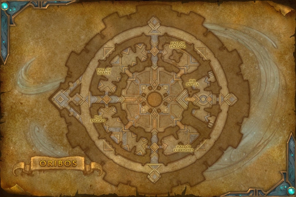 The Enclave [41, 66] is the southwestern quadrant of the Ring of Fates in Oribos. Here, representatives of the four covenants are found, alongside Tal-Inara, Honored Voice of the Arbiter, and Bolvar Fordragon. The enclave serves as the quest hub of the expansion - campaign-level storylines begin and end here. Additionally, the PvP vendor and questgivers, and the reputation quartermasters can all be found in the area. The map table, depicting Oribos and the four zones of the Shadowlands, was created by the First Ones and is able to connect to the mortal plane via an object tied to it, and the adventurer does so by using a fragment of the Helm of Domination.[1]