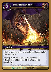 Attach to target opposing hero or ally, and Onyxia deals 5 damage to it. Ongoing: At the start of your turn, Onyxia deals X fire damage to attached character, where X is the current stage. |