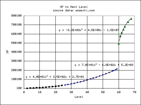 MXP(CL) = 45 + (5 × CL) (mobs in Eastern Kingdoms and Kalimdor) MXP(CL) = 235 + (5 × CL) (mobs in Outland) MXP(CL) = 580 + (5 × CL) (mobs in Northrend)