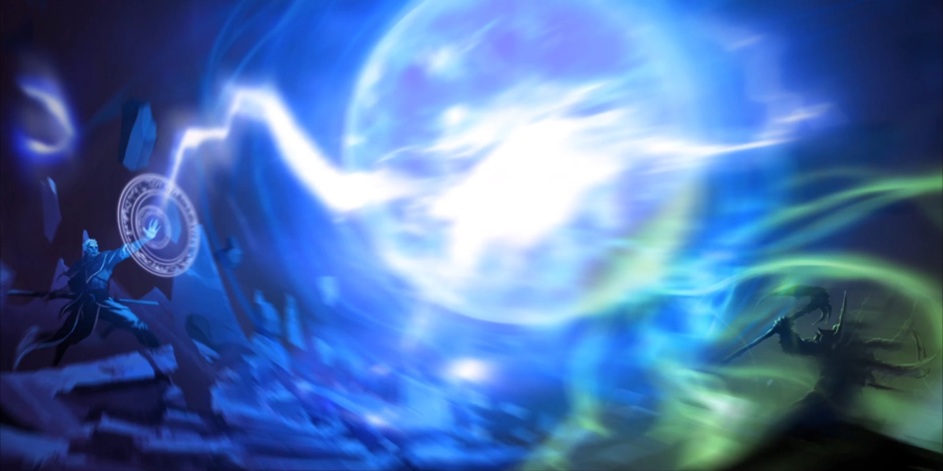 The confrontation between Archmage Khadgar and Gul'dan, a battle of arcane and fel magics.