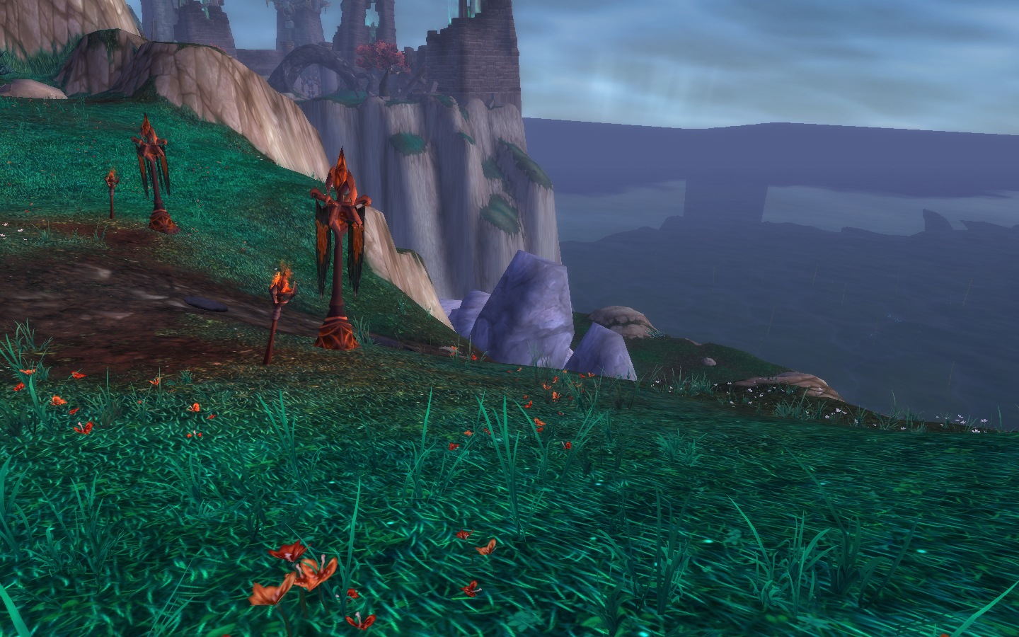 The path to the Niuzao Catacombs is just southwest of the pond and Bluesaddle, marked by a couple of banners. Just north of that is the broken bridge to Sra'vess.