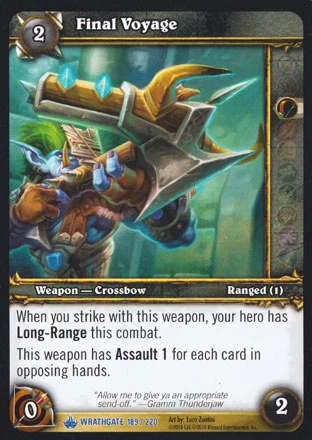 When you strike with this weapon, your hero has Long-Range this combat. This weapon has Assault 1 for each card in opposing hands. |