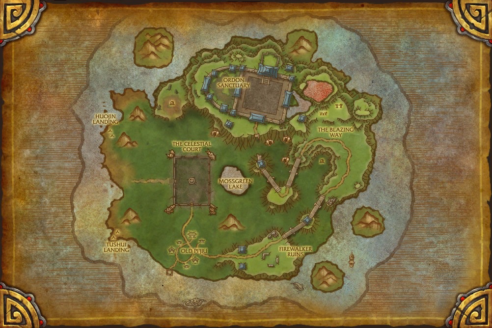 Firewalkers' Path starts at [44, 78] immediately to the east of Old Pi'jiu on the southern side of the Timeless Isle, then heads eastward through the Firewalker Ruins, turns northeast over the Croaking Hollow, past the Blazing Way and the Shrine of the Black Flame, then switches back westward to cross over the Red Stone Run before turning north and stopping at [53, 45] at the broken span before the Ordon Sanctuary.