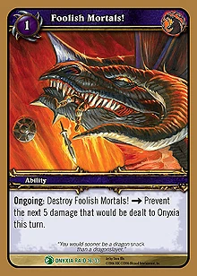 | Rules | Ongoing: Destroy Foolish Mortals! Prevent the next 5 damage that would be dealt to Onyxia this turn. |