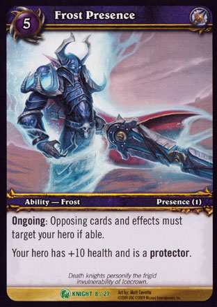 Ongoing: Opposing cards and effects must target your hero if able. Your hero has +10 health and is a Protector. |