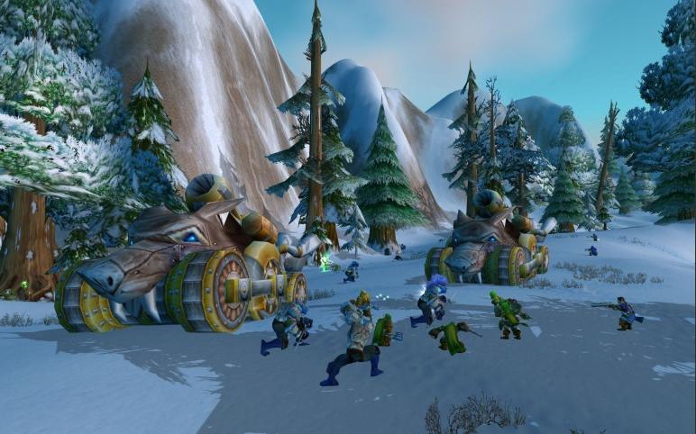 The Frostmane Front is an area controlled by the Frostmane ice trolls just west of the Frostmane Retreat in Dun Morogh. They're under attack by the nearby dwarves trying to push them back before they claim more land. A group of siege engines and mortar teams support the dwarven riflemen while destroyed ballistae and steam tanks can be seen, being scavenged by the trolls.