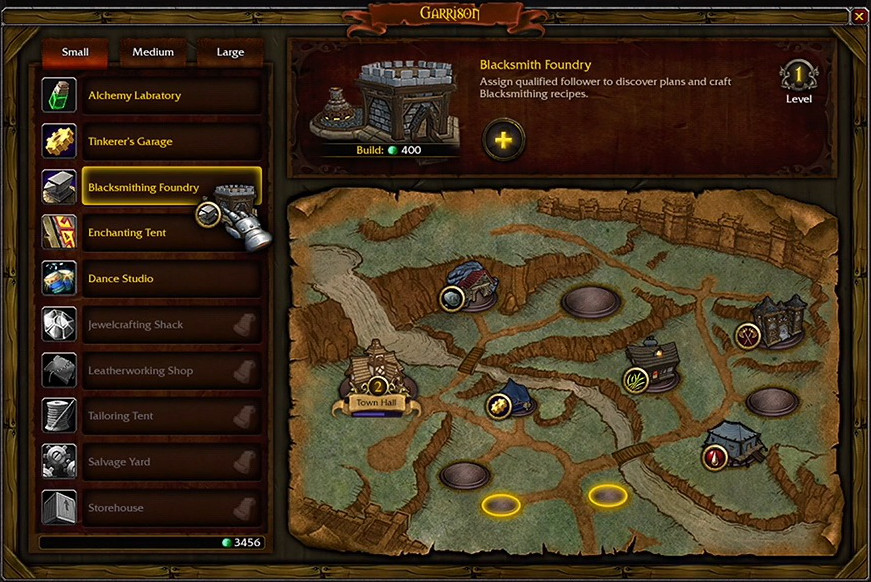 Large buildings are constructed on large plots, and provide a more specialized benefit to the player. The Mage Tower allows the player to open ogre waygates around Draenor, with up to 3 spots for portals around different zones. The Barracks provides an increase in follower capacity, and also lets the player pick a follower to accompany them out into the world to help combat the savage wilds of Draenor.