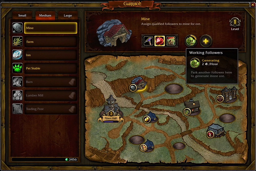 Medium buildings are constructed on medium plots, and provide a variety of benefits around Draenor and in your garrison. The Inn allows the player to find and add followers with specific traits or abilities, and offers another rested area in the garrison. The Barn allows for the trapping of Draenor beasts, providing ways to gain leather, cloth and