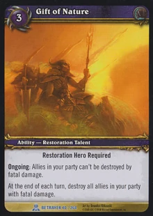 Restoration Hero Required Ongoing: Allies in your party can't be destroyed by fatal damage. At the end of each turn, destroy all allies in your party with fatal damage. |