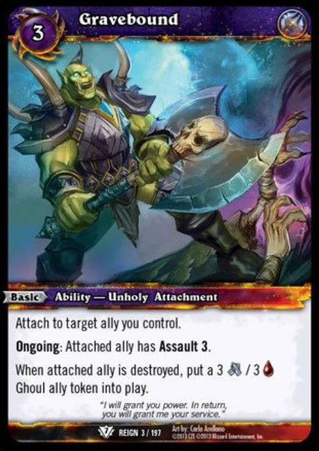 Attach to target ally you control. Ongoing: Attached ally has Assault 3. When attached ally is destroyed, put a 3 Melee Damage / 3 Health Ghoul ally token into play. |