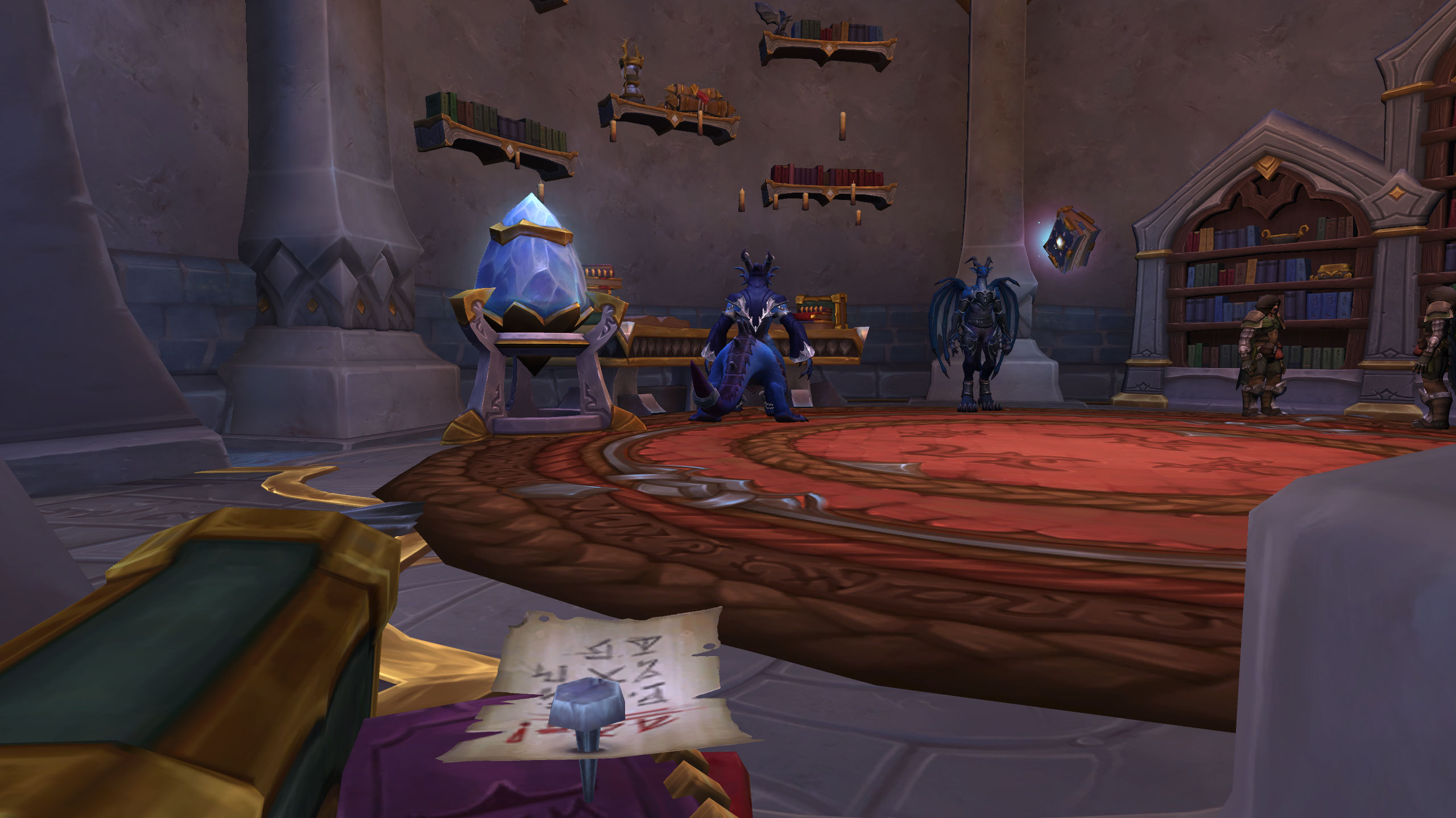 Head to [48.5, 13.9] northeast of the Sapphire Enclave to find Noah Scribeson in front of a bunch of magicked candles and reset the thinking cap there. Find the Researcher's Note at [37.6, 37.2] on some books in the southwest corner of the room with Rethelshi, Ezra, and Mythressa that reads: