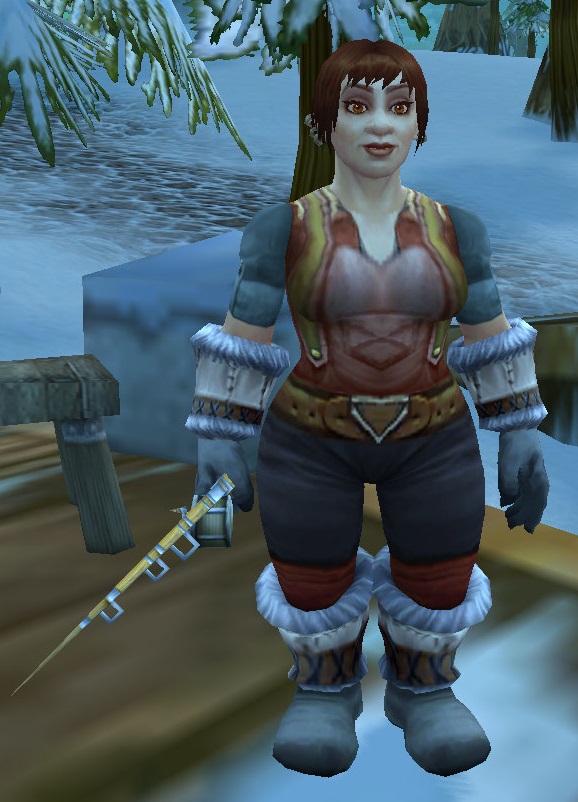 Gretta Ganter is a dwarf fishing vendor located on Iceflow Lake just outside Brewnall Village in Dun Morogh.